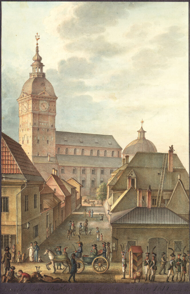 Vy från Stortorget över Stora Kyrkogatan mot domkyrkan. Carl Ludvig Engel, 1814. Bild: Nationalbiblioteket.