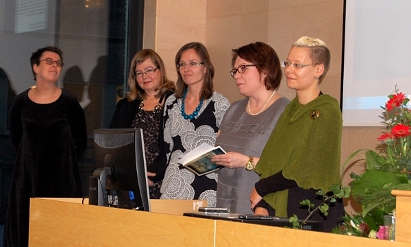 Meri Heinonen, Hanne Koivisto, Heli Rantala, professori Marjo Kaartinen ja Anu Salmela esittelemässä toimittamaansa kulttuurihistorian juhlajulkaisua Toden tarinoita, joka poikkeuksellisesti sisältää oppiaineen piirissä tuottettuja kaunokirjallisia tekstejä sekä kuvataidetta