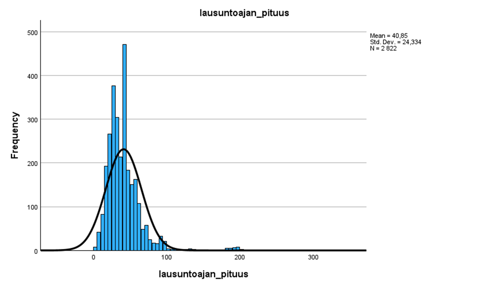 Ensin SPSS:llä otetaan keskiluvut sekä histogrammit muuttujista lausuntoajan_pituus (lausuntoajan kesto) ja lausunnot_määrä (annettujen lausuntojen määrä) tarkoituksena arvioida silmämääräisesti muuttujien normaaliutta. Keskiluvut näistä muuttujista esitellään taulukossa 8 ja histogrammit kuvioissa 1 ja 2.