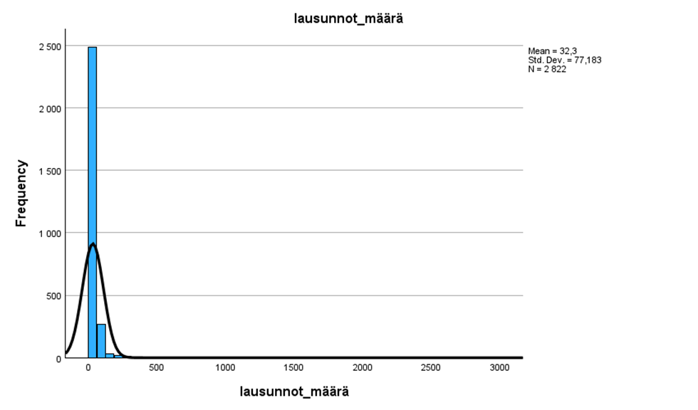 Kuvioiden 1 ja 2 histogrammeista ilmenee, että lausuntoajan_pituus on silmämääräisesti melko lähellä normaalisti jakautumista, kun taas lausunnot_määrä ei edes silmämääräisesti näytä normaalisti jakautuneelta. Seuraavaksi otetaan testit, joilla selvitetään, ovatko nämä muuttujat normaalisti jakautuneita. Näiden testien tulokset esitellään taulukoissa 9 ja 10.