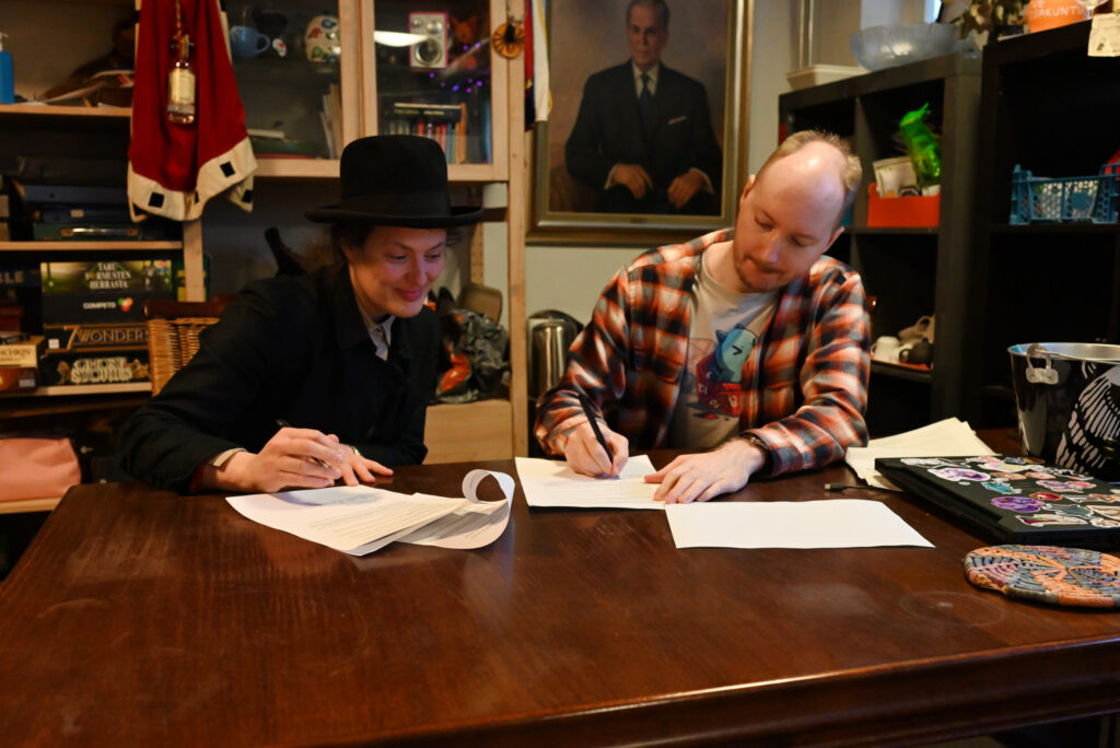 TVO:n Seniorit ry:n puheenjohtaja Sara Bronstein ja S-Osakuntien Eero Pihkala allekirjoittavat vuokrasopimuksen.